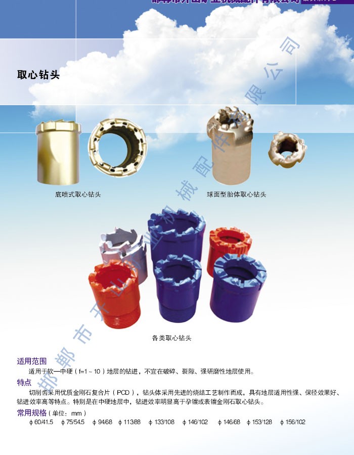 金剛石取心鉆頭是選用高品級金剛石單晶或天然金剛石顆粒,經過科學配方和特殊工藝加工而成,具有性能穩(wěn)定 、耐磨性高、適巖性廣的特點,適用于f=1-16級的中硬、堅硬、破碎及疊層的強研磨性巖層的鉆進。它具備以下優(yōu)點: 鉆頭壽命長:以金剛石復合片為主切削齒,其使用壽命是硬質合金的10倍以上,是普通金剛石鉆頭的4~5倍;鉆進效率高:金剛石出露量大(復合多晶層幾乎全部出露),鉆頭能始終保持銳利,因而大大提高進尺速度;可低壓、低轉速鉆進:鉆頭以刮擦、剪切來破碎巖石,其鉆壓只需同徑金剛石孕鑲鉆頭鉆壓1/3左右;保徑效果好:我公司復合片鉆頭內外可鑲嵌金剛石聚晶保徑,耐磨性強,保徑性能好,能使切削齒得到高效利用 ;
