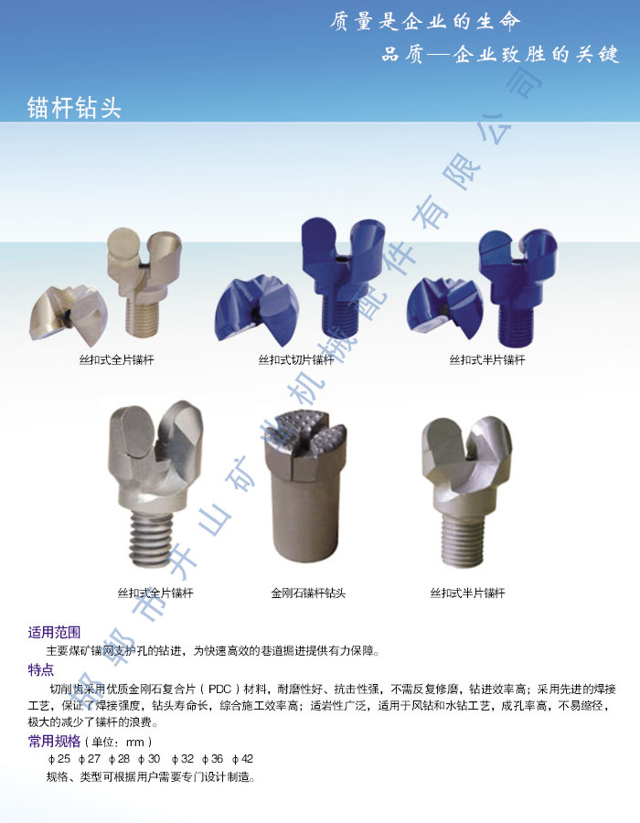 主要產(chǎn)品:鉆桿、金剛石鉆頭、煤截齒、螺旋鉆桿、支護、刮板機、鐵路配件、配套鉆具