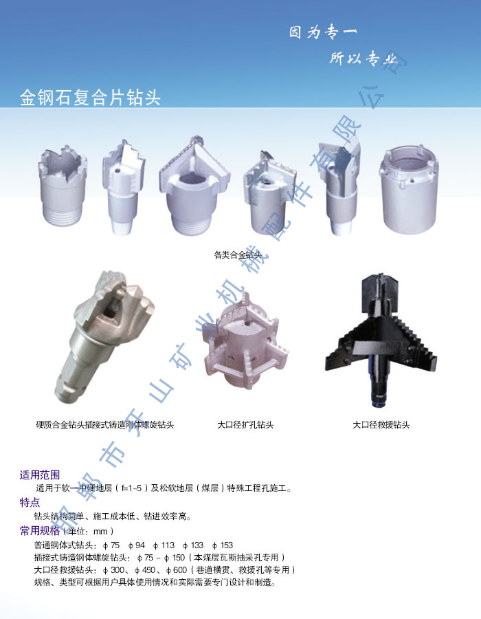 邯鄲市開山礦業(yè)機械配件有限公司是邯鄲地區(qū)專業(yè)生產(chǎn)鐵路工礦配件的大型企業(yè),企業(yè)占地5500余平方米, 員工139余人,其中高級技師11名。企業(yè)擁有先進的生產(chǎn)設備多套,高標準的技術(shù)人員,完善的檢測手段,從而保 證了產(chǎn)品的質(zhì)量。多年來,始終以一流的產(chǎn)品質(zhì)量,一流的商業(yè)信譽服務客戶。本廠專業(yè)生產(chǎn):錨桿、煤鉆桿、 風鉆桿、煤鉆頭、錨桿鉆頭、風鉆頭、金剛石鉆頭、復合片鉆頭、空心螺旋鉆桿、探水鉆桿、鉆尾、接頭、采煤 機配件、鎬型截齒、刀型截齒、鐵路配件。